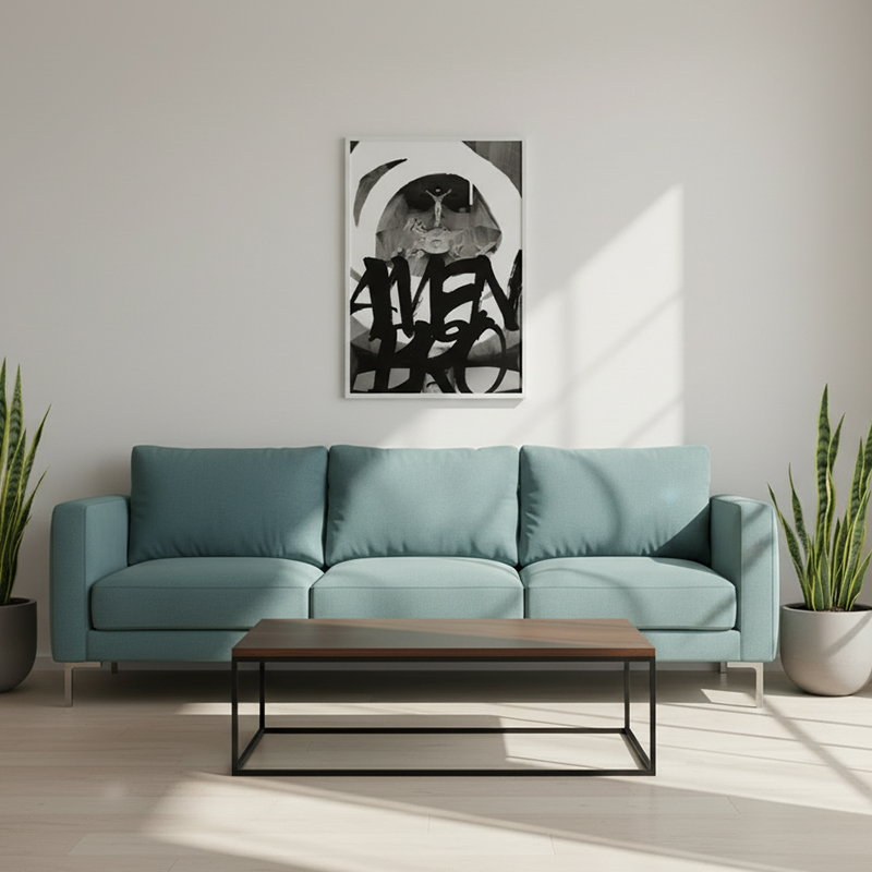 It is overlaid with bold black graffiti-style lettering that says “Amen Bro.” A graffiti spray circle emphasizes the faith element. This Amen Bro Graffiti Print is perfect for your home or office. It blends street style with a spiritual message.