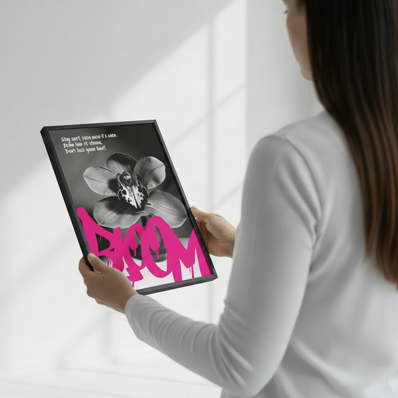 This art is for modern lofts and creative studios. It is for anyone drawn to rebellious design. This BLOOM Graffiti Print is a reminder to protect your softness. It inspires you to bloom against all odds.