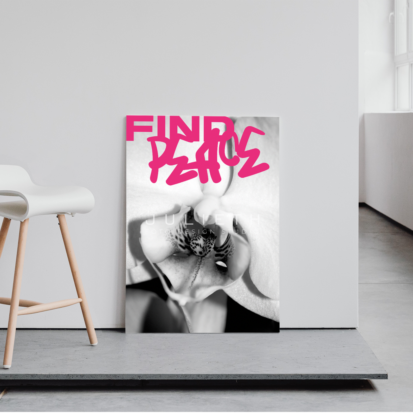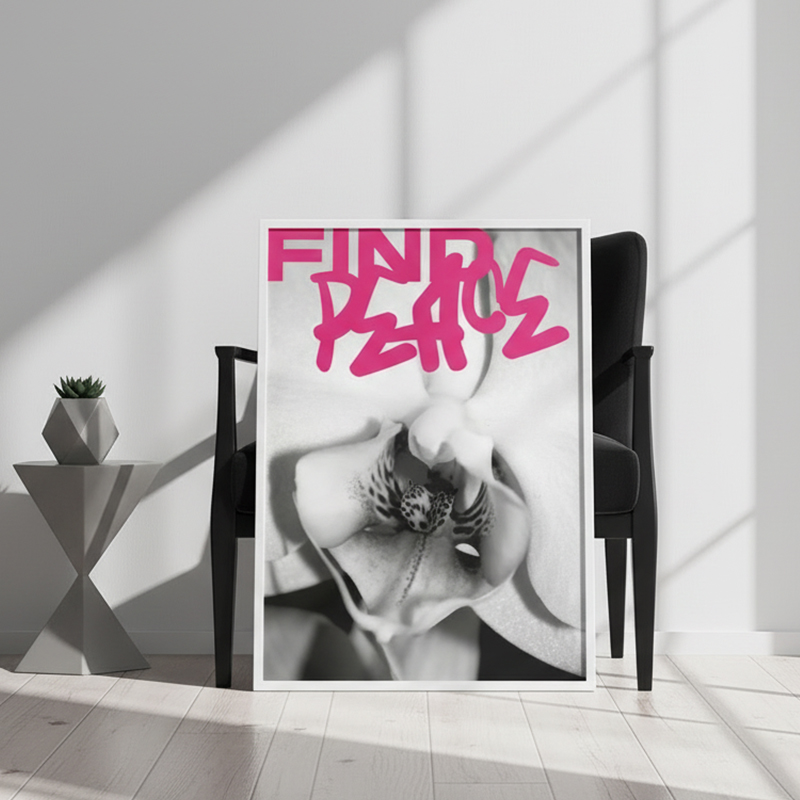 This digital wall art features original urban photography combined with powerful graffiti-style typography: “Choose love over fear – Let love lead the way”. The bold black and pink letters dance over a striking orchid photo, creating a contrast between softness and strength.