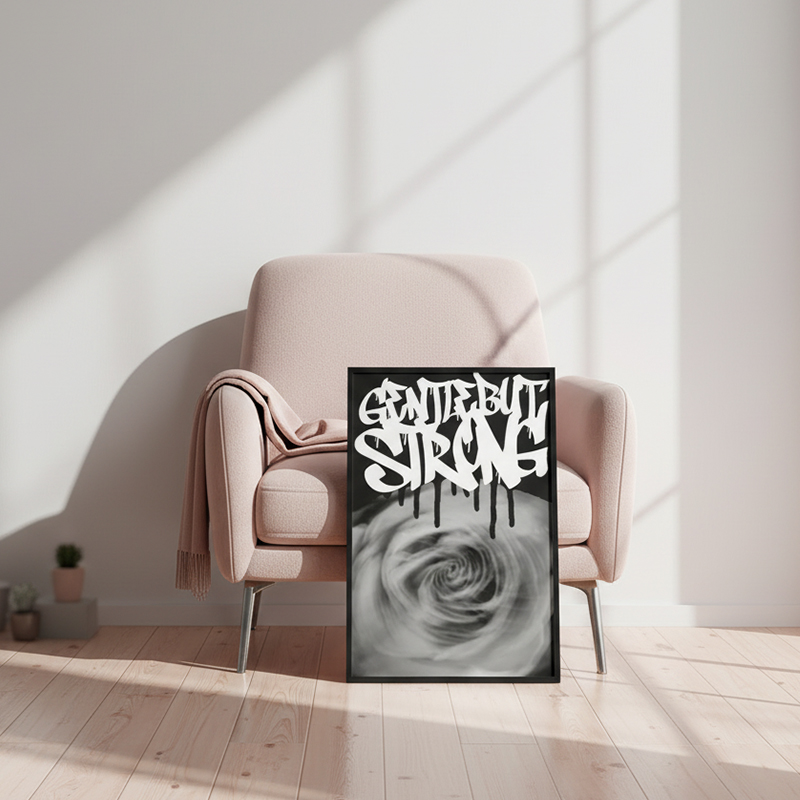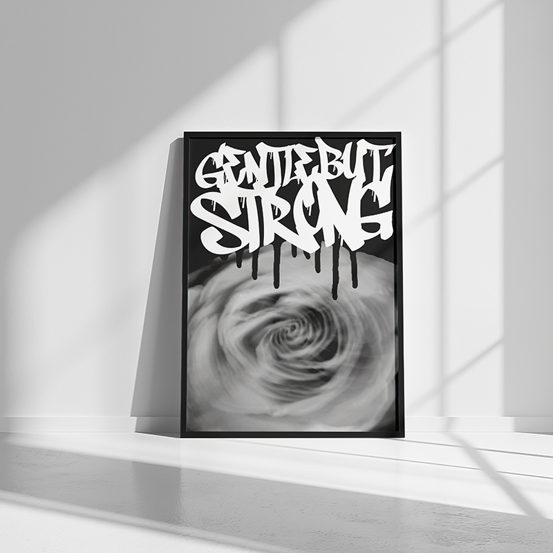 The image is layered with bold white graffiti lettering. It also features a dripping black spray effect. This Gentle But Strong Graffiti Print proves that power and gentleness can coexist. It is perfect for emotional spaces.