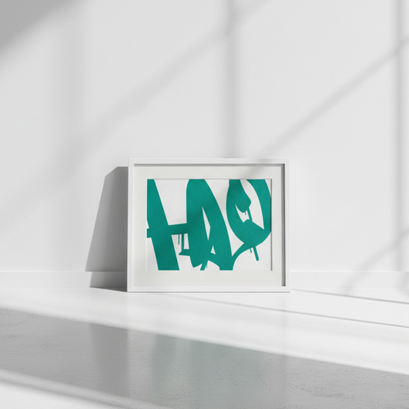 The lettering is a bold, turquoise graffiti style. It sits on a clean and simple white background.